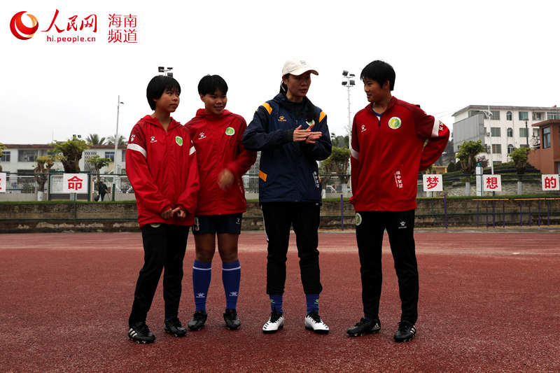 Chen Qiaocui, a coach of the Qiongzhong Women’s Football Team in south China’s Hainan Province, instructs team members. (People’s Daily Online/Fu Wuping)