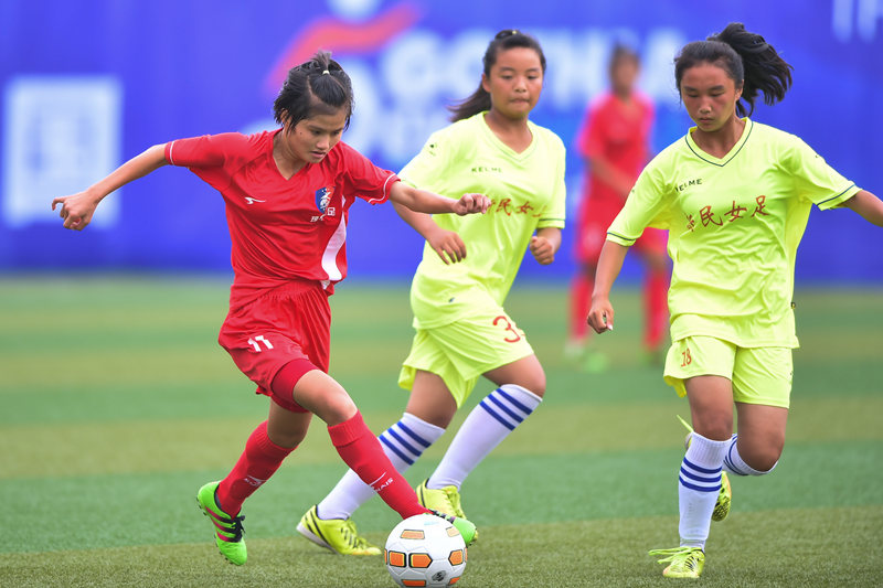 Wang Huimin, a member of the Qiongzhong Women’s Football Team in south China’s Hainan Province, competes in a match during the Gothia Cup in 2017. (Photo courtesy of the interviewee)