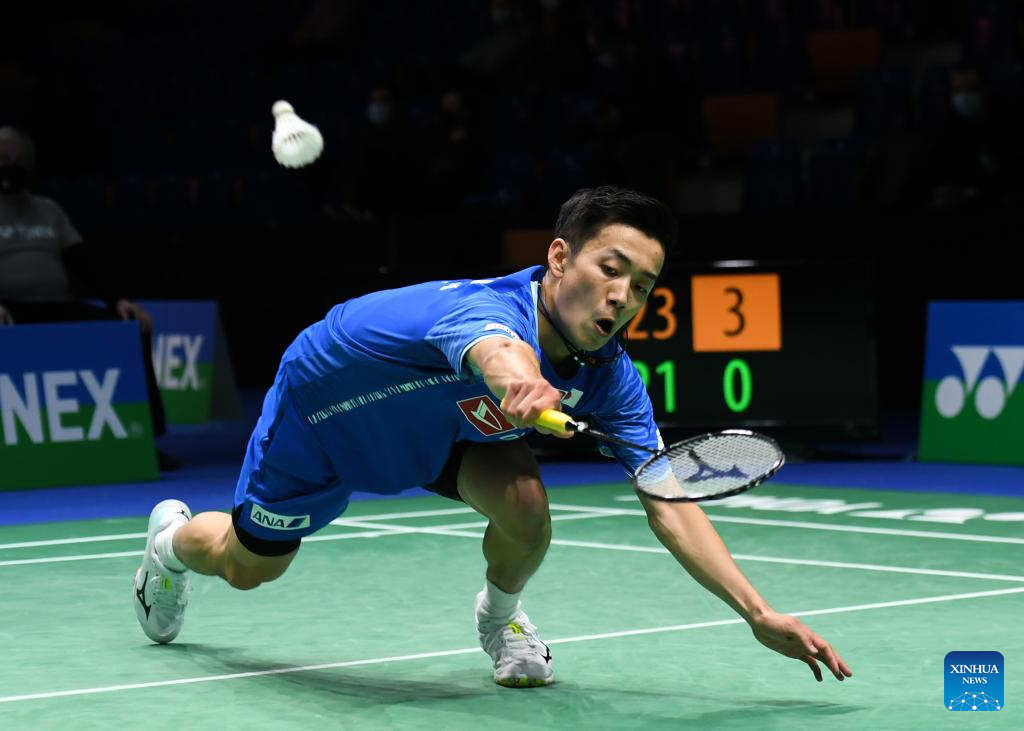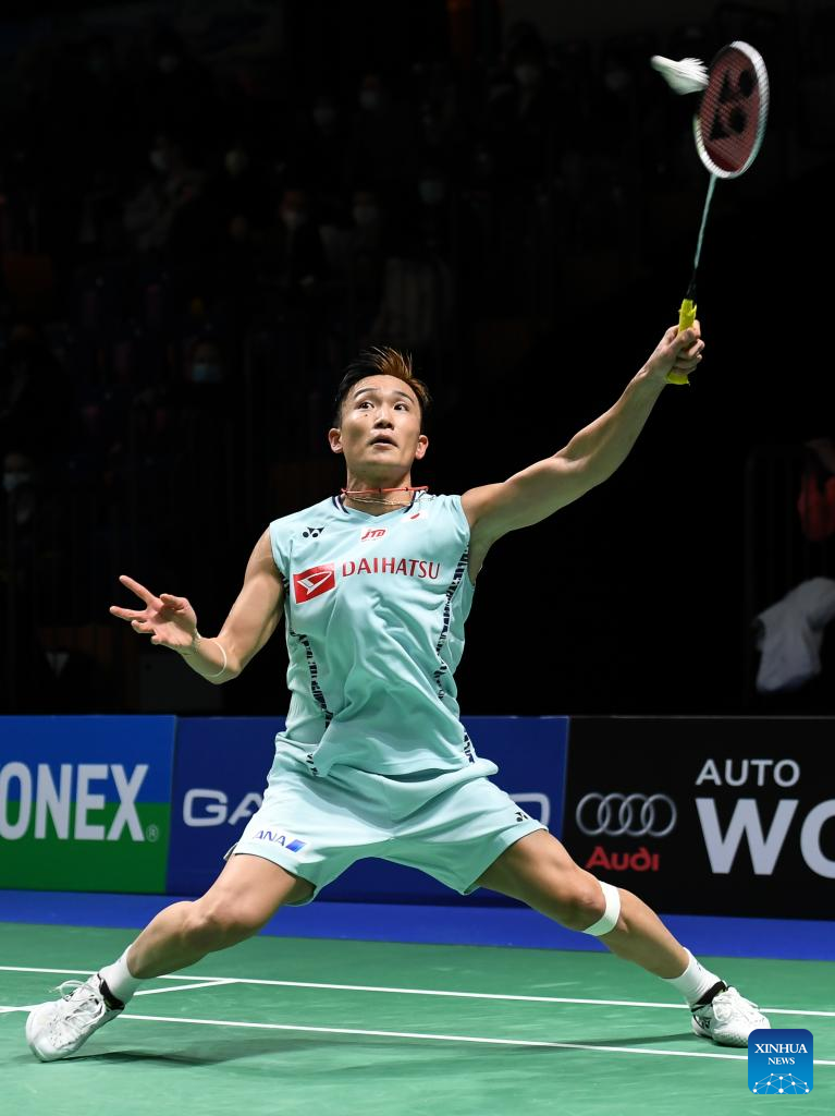 Momota Kento of Japan hits a return during the men's singles first round match against his compatriot Nishimoto Kenta at the Yonex German Open 2022 badminton tournament in Muelheim, Germany, March 9, 2022. (Xinhua/Lu Yang)
