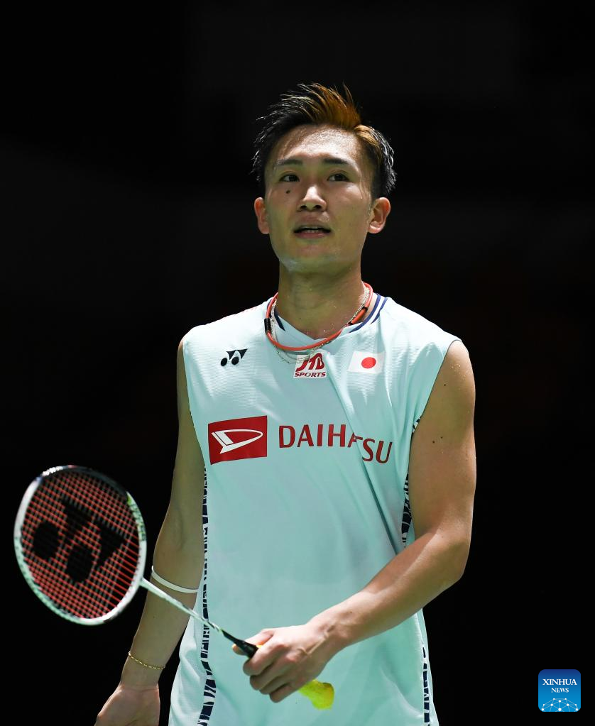 Momota Kento of Japan reacts during the men's singles first round match against his compatriot Nishimoto Kenta at the Yonex German Open 2022 badminton tournament in Muelheim, Germany, March 9, 2022. (Xinhua/Lu Yang)