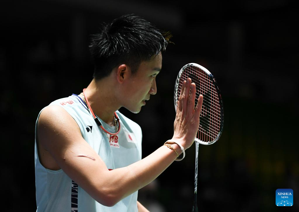 Momota Kento of Japan gestures to spectators after the men's singles first round match against his compatriot Nishimoto Kenta at the Yonex German Open 2022 badminton tournament in Muelheim, Germany, March 9, 2022. (Xinhua/Lu Yang)