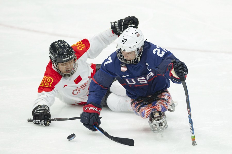 Josh Pauls (R) of the United States vies with Shen Yifeng of China during the Para Ice Hockey semifinal at the Beijing 2022 Paralympic Winter Games, March 11, 2022. (Xinhua/Cai Yang)