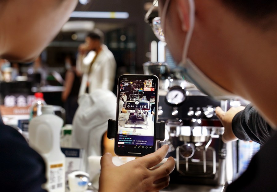 Staff members promote coffee machines via livestreaming at the Consumer Goods Exhibition Area of the 4th China International Import Expo in east China's Shanghai, Nov. 9, 2021. (Xinhua/Liu Ying)