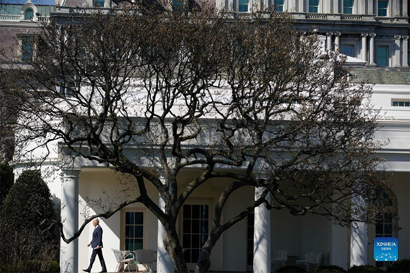 U.S. President Joe Biden walks on the South Lawn to board Marine One at the White House in Washington, D.C. March 11, 2022. The U.S. government will revoke Russia's most-favored nation trade status amid the Ukraine crisis, the White House said Friday, noting that it will work with Group of Seven (G7) countries and the European Union to roll out new sanctions. (Photo by Ting Shen/Xinhua)