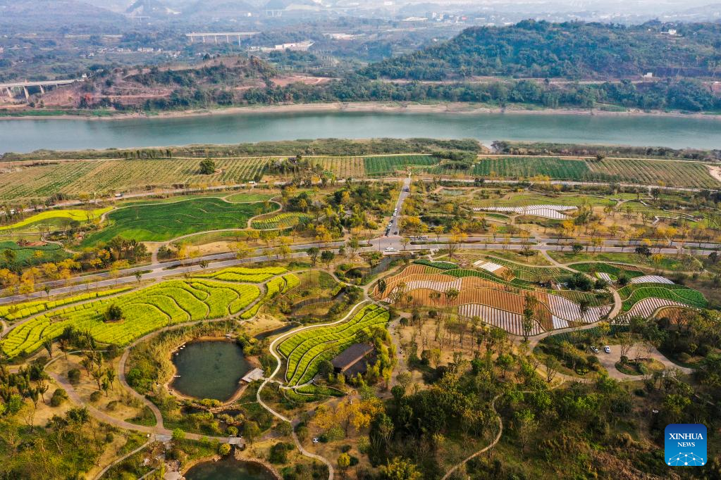 Aerial photo taken on March 10, 2022 shows the scenery of Guangyang Isle in southwest China's Chongqing. Guangyang Isle, the largest island on the upper Yangtze River, is rich in natural resources. In recent years, a series of measures have been taken to restore the natural ecological environment of the island. Now, the island attracts a large number of tourists every spring. (Xinhua/Wang Quanchao)