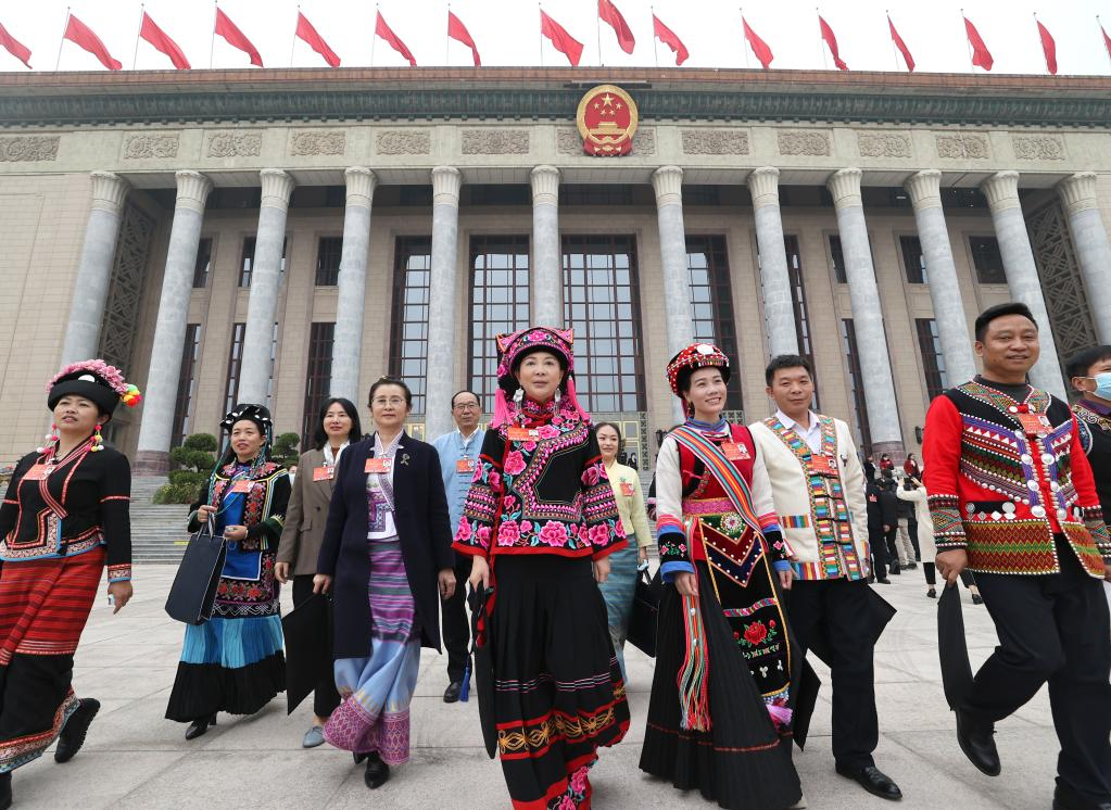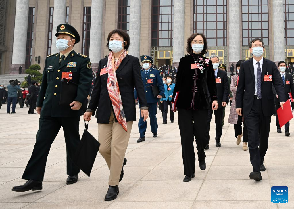 Deputies to the 13th National People's Congress (NPC) leave the Great Hall of the People after the closing meeting of the fifth session of the 13th NPC in Beijing, capital of China, March 11, 2022. (Xinhua/Chen Zhonghao)
