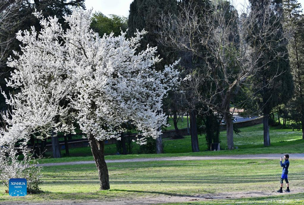 A man takes photos at Villa Borghese in Rome, Italy, on March 11, 2022. (Xinhua/Jin Mamengni)