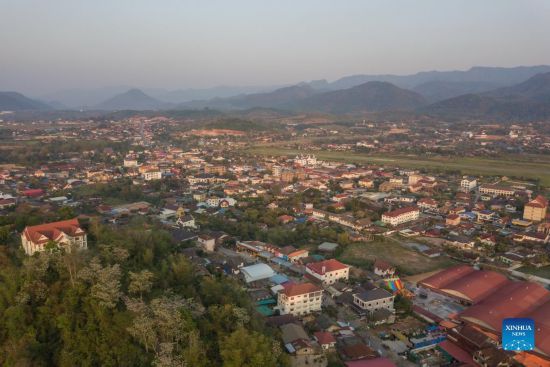 Aerial photo taken on March 9, 2022, shows a view of Muangxay, a business town along the China-Laos Railway in northern Laos. Since its opening in December 2021, the China-Laos Railway has been injecting impetus into the development of the business hub in northern Laos, Muangxay, by facilitating logistics and the passengers' travelling, and promoting the trade between China and Laos. (Photo by Kaikeo Saiyasane/Xinhua)