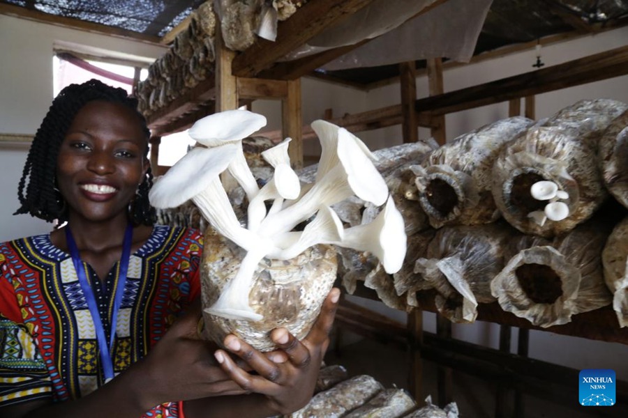 Bathsheba Mchuza, founder and sales officer for Uyogaplus project, shows the growing of mushroom during a workshop on "Applications of Juncao Technology and its Contribution to the Achievement of Sustainable Agriculture and the Sustainable Development Goals in Tanzania" in Kinondoni District, outskirts of Dar es Salaam, Tanzania, on March 10, 2022. (Photo by Herman Emmanuel/Xinhua)