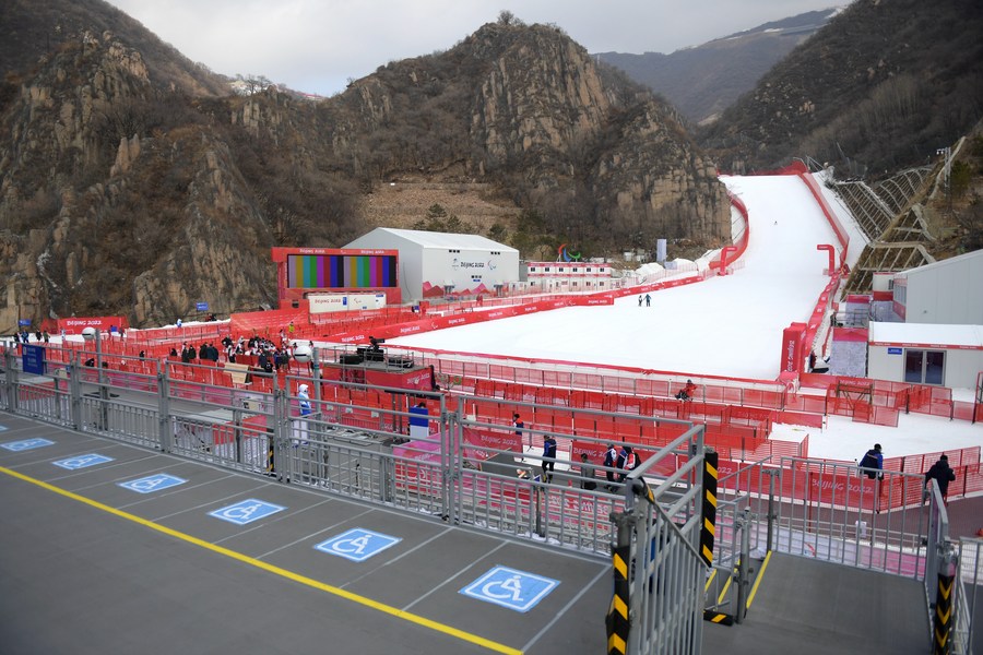 Photo taken on Feb. 28, 2022 shows the barrier-free seats in China's National Alpine Skiing Center in Yanqing District, Beijing. (Xinhua/Zhang Chenlin)