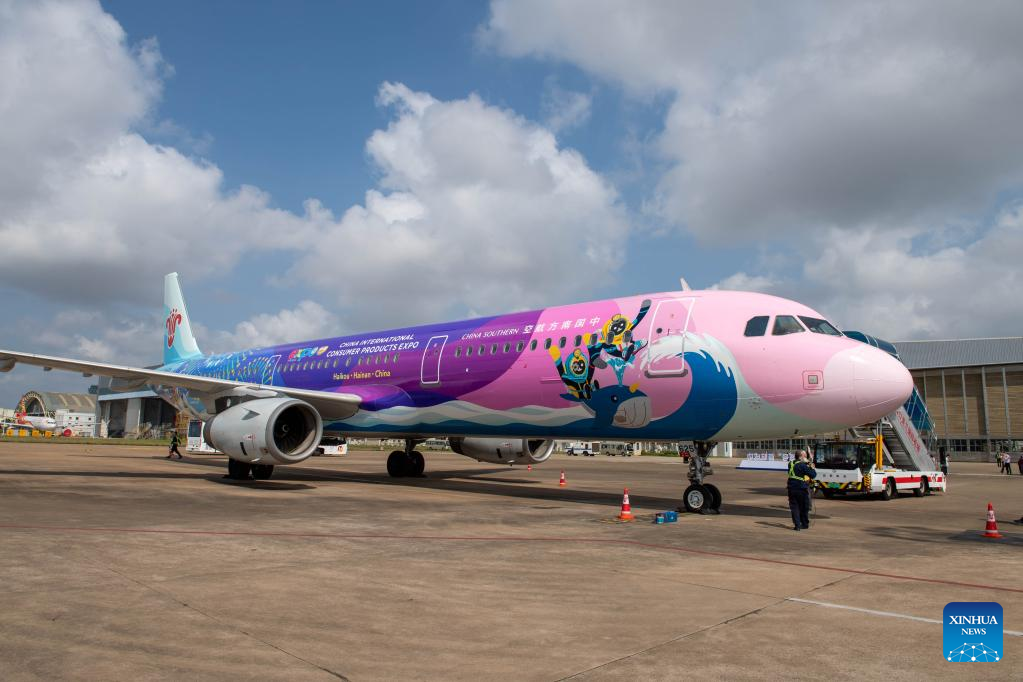A plane painted with patterns of the China International Consumer Products Expo arrives at Meilan International Airport in Haikou, south China's Hainan Province, March 13, 2022. China Southern Airlines' aircraft themed with International Consumer Products Expo arrived in Haikou on Sunday, completing its maiden flight. (Xinhua/Zhang Liyun)