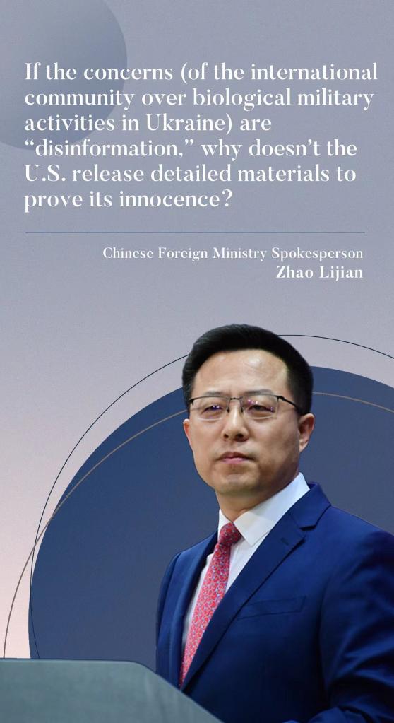 "Biological military activities in Ukraine are the common concern of the international community," Zhao said, citing information already disclosed about U.S. participation in and funding of biological laboratories in Ukraine that hold lethal pathogens.