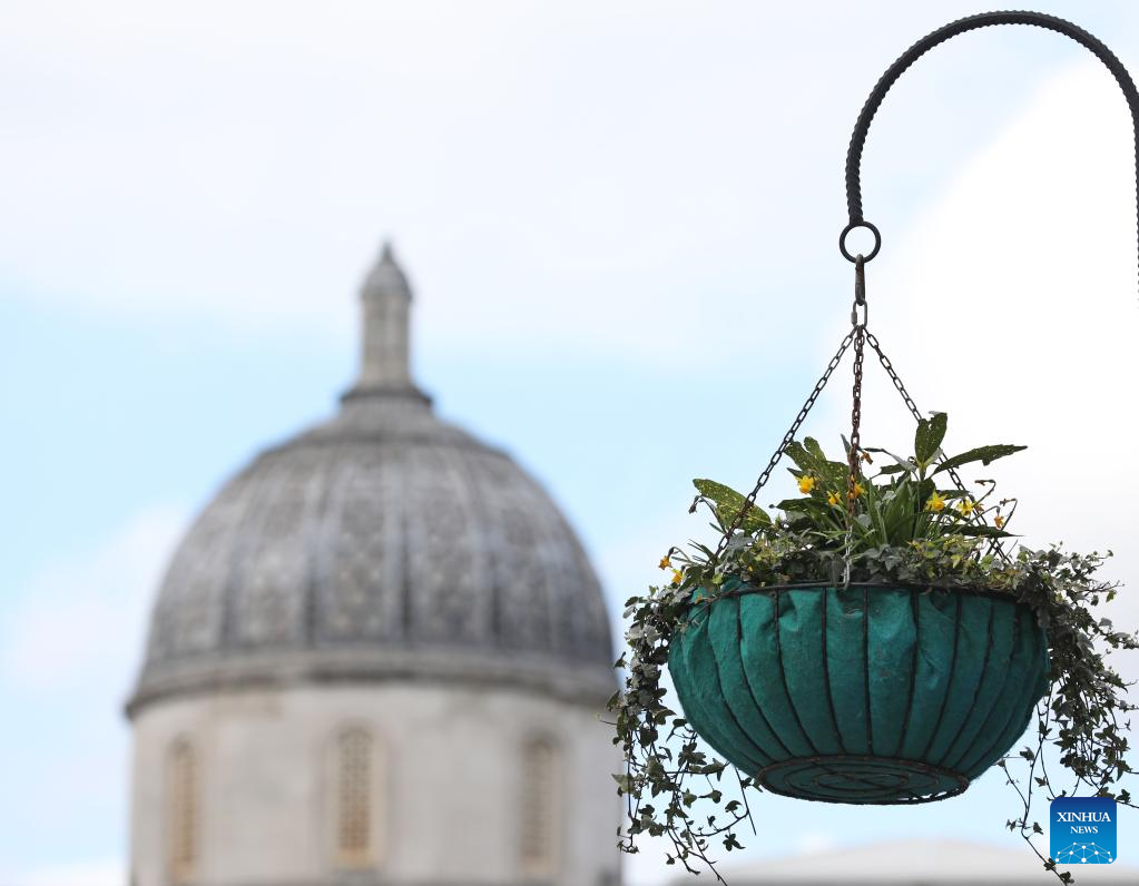 Flowers are seen near Trafalgar Square in London, Britain, March 14, 2022. (Xinhua/Li Ying)