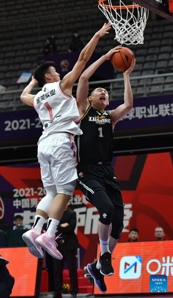 Fu Hao (R) of Liaoning Flying Leopards competes during the 35th round match between Liaoning Flying Leopards and Sichuan Blue Whales at the 2021-2022 season of the Chinese Basketball Association (CBA) league in Shenyang of northeast China's Liaoning Province, March 15, 2022. (Xinhua/Wang Yijie)