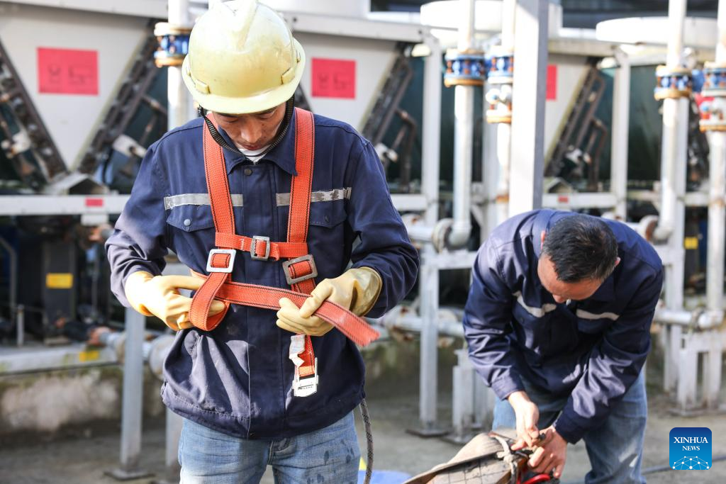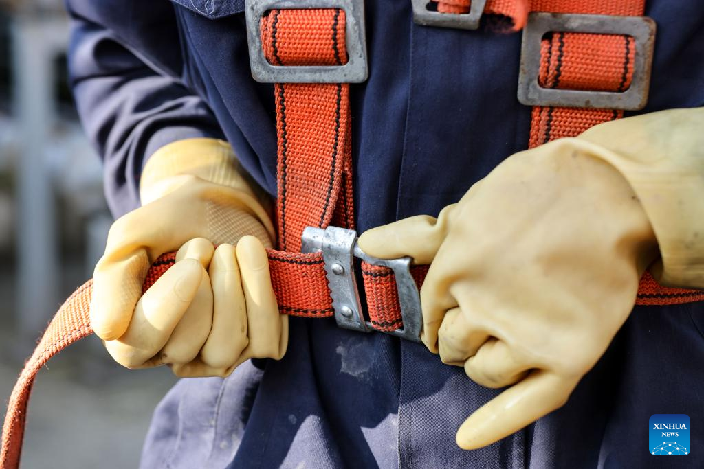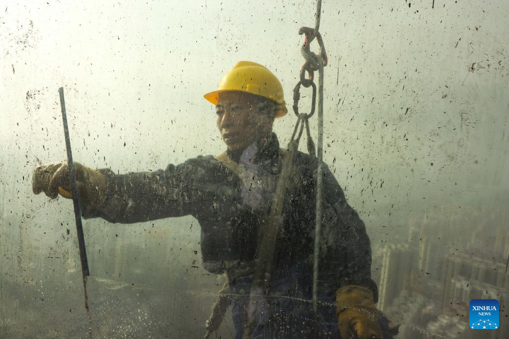 A skyscraper window cleaner fastens his safety harness before cleaning the exterior of Guiyang International Trade Center in Guiyang, southwest China's Guizhou Province, March 15, 2022. The 335-meter-high twin skyscrapers of Guiyang International Trade Center recently saw their first exterior wall cleaning this year. The cleaning, carried out by eight workers, is expected to take about 20 days. (Xinhua/Ou Dongqu)