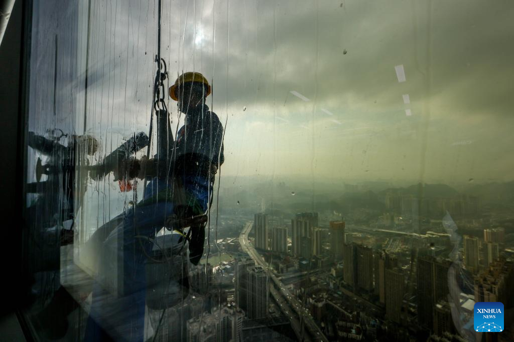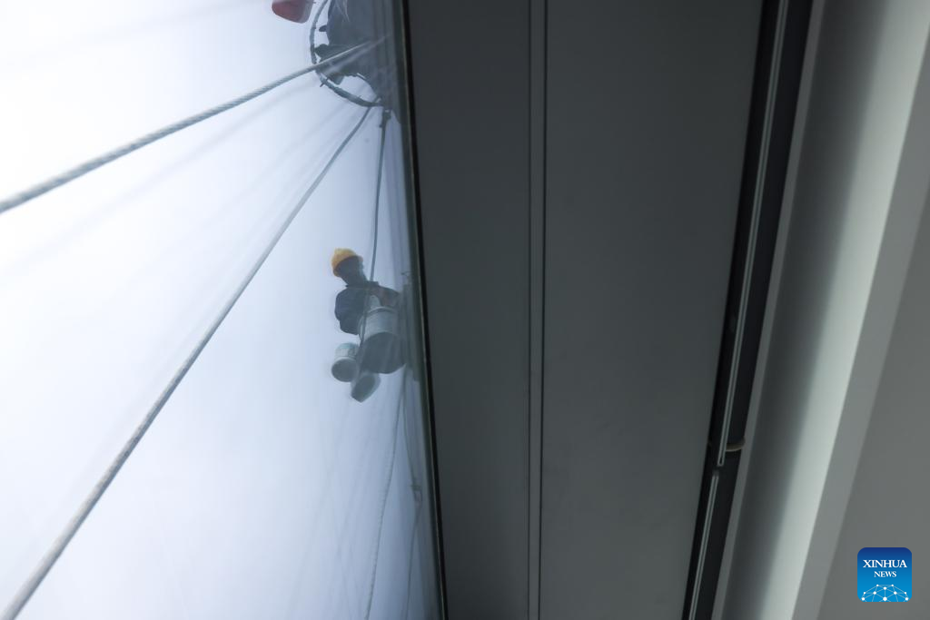 A skyscraper window cleaner prepares to clean the exterior of Guiyang International Trade Center in Guiyang, southwest China's Guizhou Province, March 15, 2022. The 335-meter-high twin skyscrapers of Guiyang International Trade Center recently saw their first exterior wall cleaning this year. The cleaning, carried out by eight workers, is expected to take about 20 days. (Xinhua/Ou Dongqu)