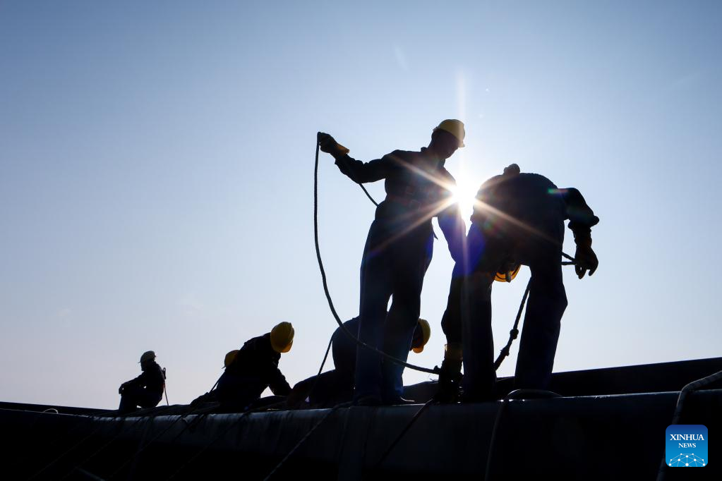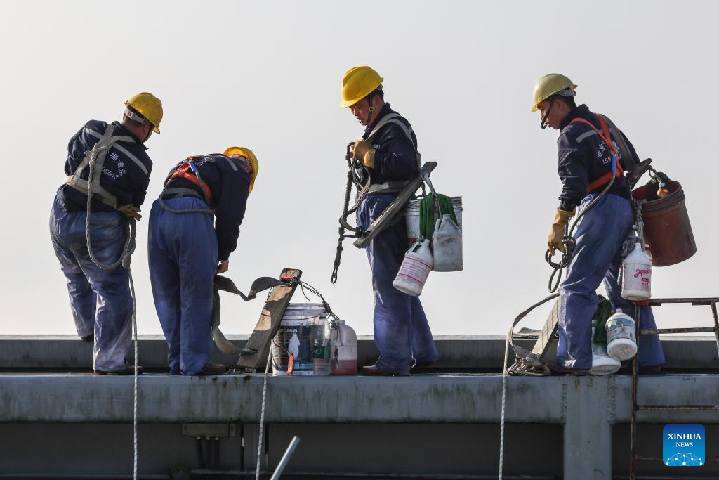 Skyscraper window cleaners prepare to clean the exterior of Guiyang International Trade Center in Guiyang, southwest China's Guizhou Province, March 15, 2022. The 335-meter-high twin skyscrapers of Guiyang International Trade Center recently saw their first exterior wall cleaning this year. The cleaning, carried out by eight workers, is expected to take about 20 days. (Xinhua/Ou Dongqu)