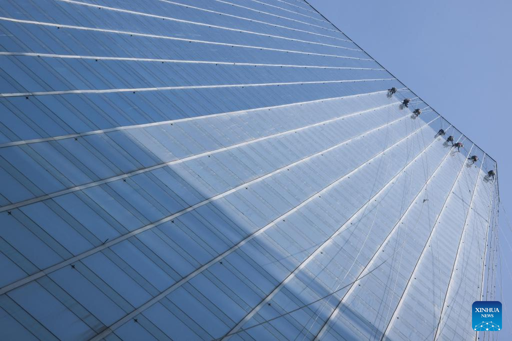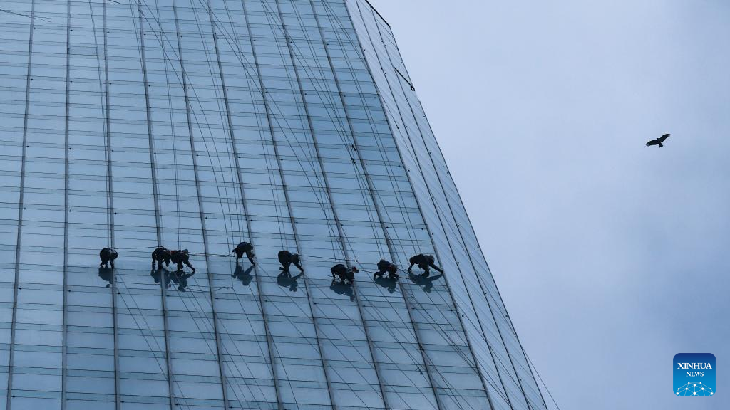 Skyscraper window cleaners clean the exterior of Guiyang International Trade Center in Guiyang, southwest China's Guizhou Province, March 15, 2022. The 335-meter-high twin skyscrapers of Guiyang International Trade Center recently saw their first exterior wall cleaning this year. The cleaning, carried out by eight workers, is expected to take about 20 days. (Xinhua/Ou Dongqu)