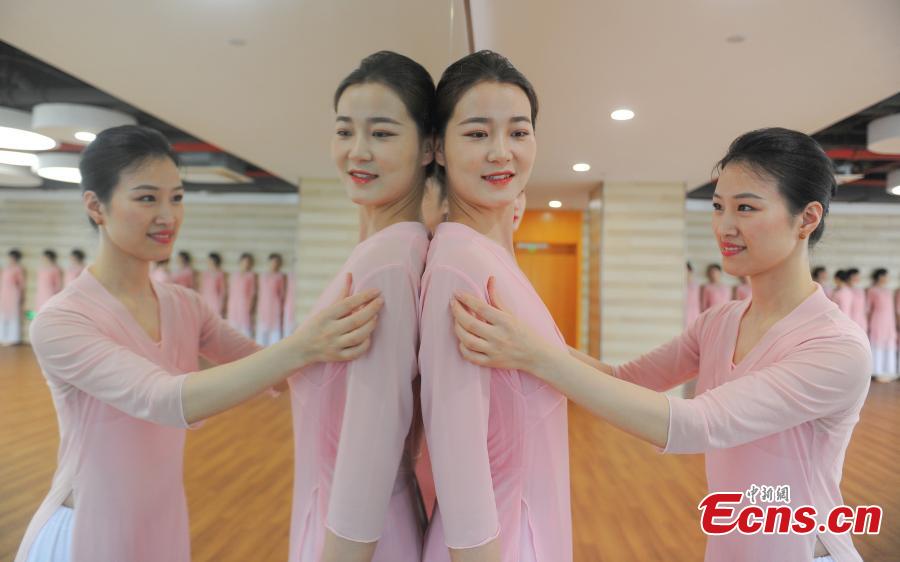 Photo shows flight attendants of Zhejiang Loong Airlines undergoing rigorous posture training, March 14, 2022. A total of 300 flight attendants received an etiquette training, including 13 courses for Hangzhou 2022 Asian Games, which will be held from Sept. 10 to 25, 2022 in Hangzhou, Zhejiang Province. (Photo: China News Service/Wang Gang)