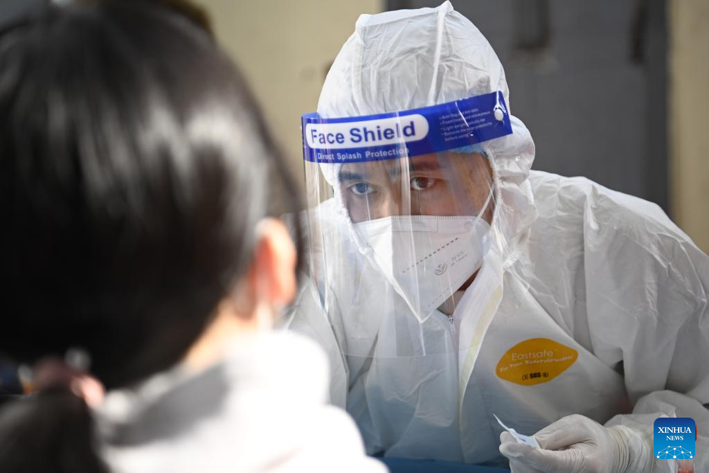 A medical worker takes a swab sample from a resident for nucleic acid testing in Xigang Township of Tengzhou City, east China's Shandong Province, March 15, 2022. (Photo by Li Zhijun/Xinhua)