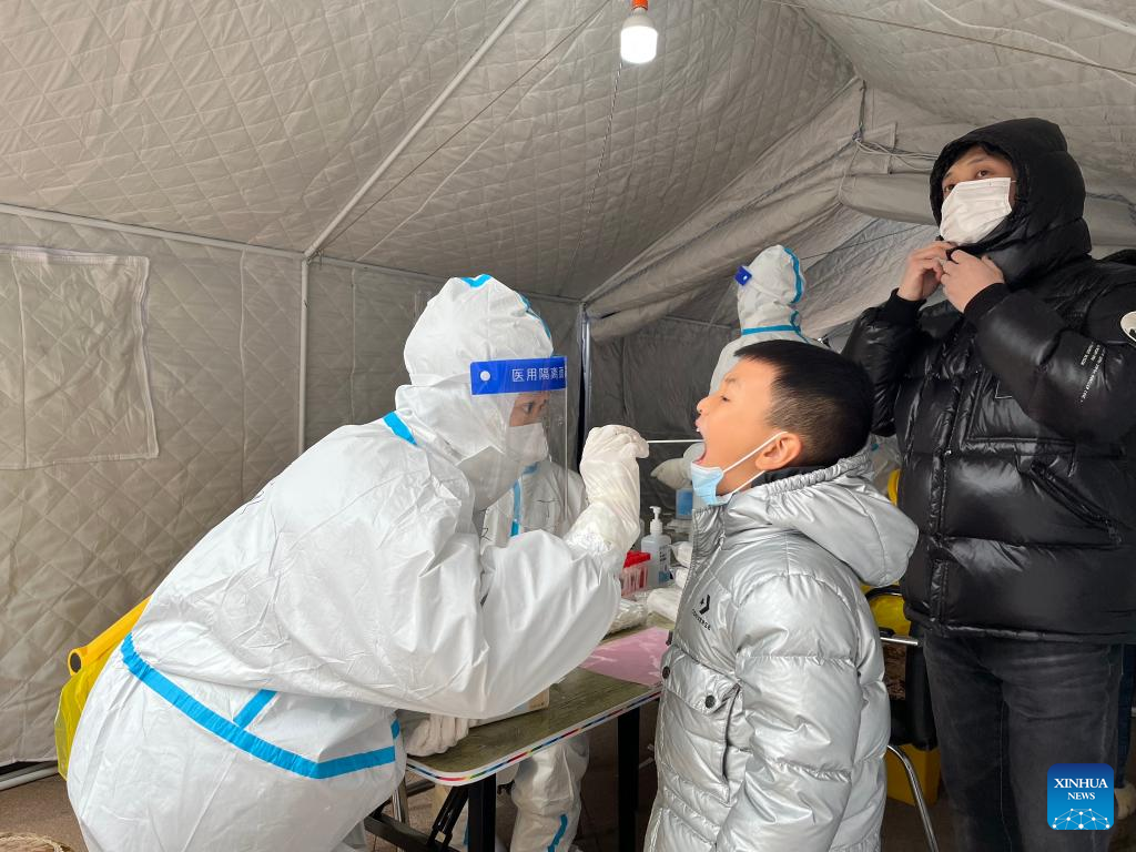 Cellphone photo taken on March 15, 2022 shows a medical worker taking a swab sample from a resident for nucleic acid test in Changchun, northeast China's Jilin Province, March 15, 2022. Jilin Province reported 3,076 new locally transmitted COVID-19 cases on Monday. (Xinhua/Zhao Dandan)