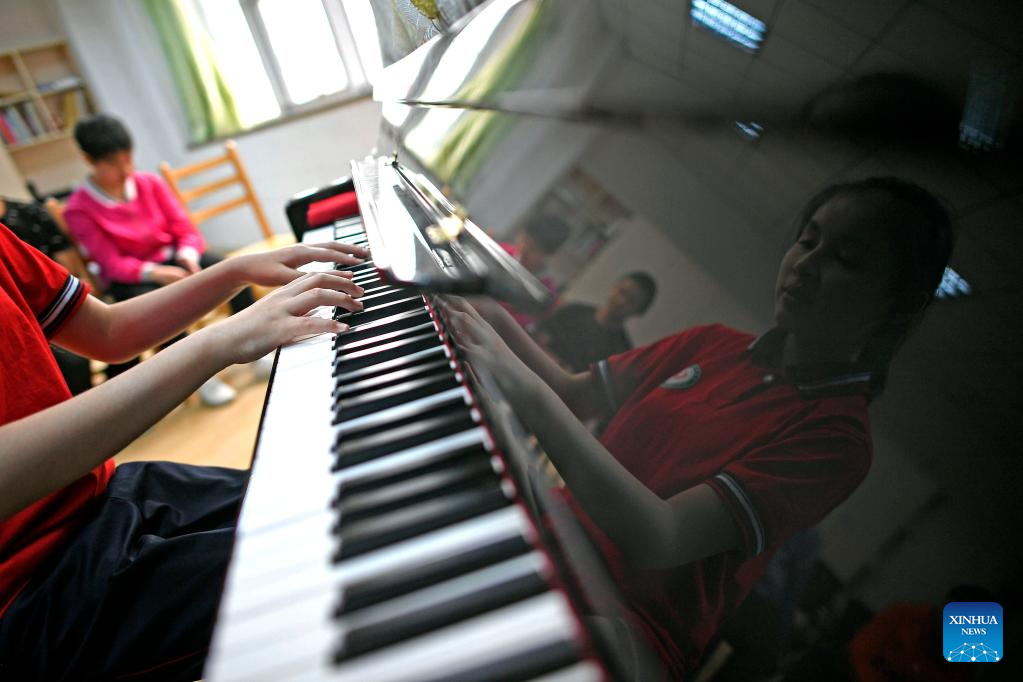 Ma Yifei plays the piano during a music class in Yinchuan, northwest China's Ningxia Hui Autonomous Region, May 16, 2018.