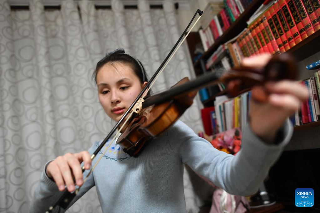 Ma Yifei plays the Beijing 2022 theme song, Snowflake, on her violin at home in Yinchuan, northwest China's Ningxia Hui Autonomous Region, March 14, 2022.(Photo by Li Jing/Xinhua)