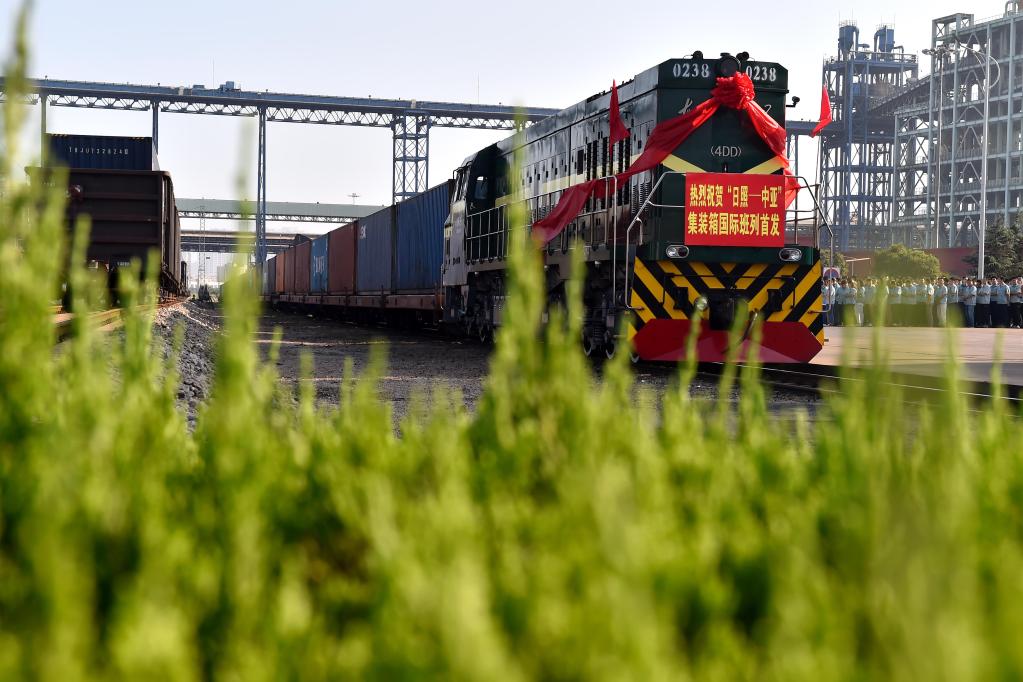 A freight train from Rizhao to Central Asia leaves a container station of Rizhao port in east China's Shandong Province, Sept. 12, 2017. (Xinhua/Guo Xulei)