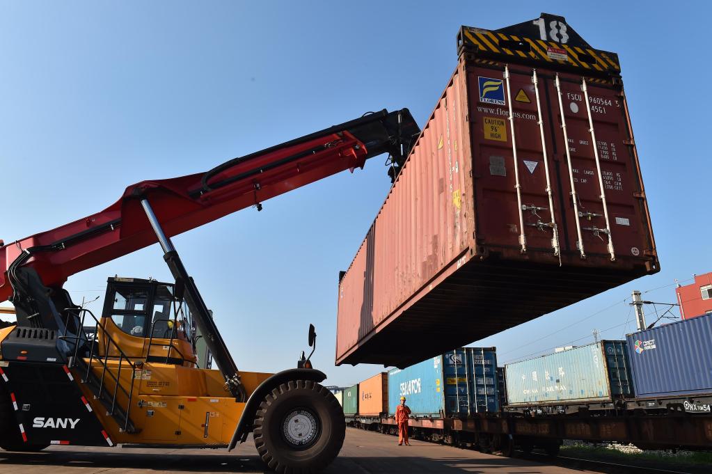 A container is loaded onto the freight train from Rizhao to Central Asia at a container station of Rizhao port in east China's Shandong Province, Sept. 12, 2017. (Xinhua/Guo Xulei)