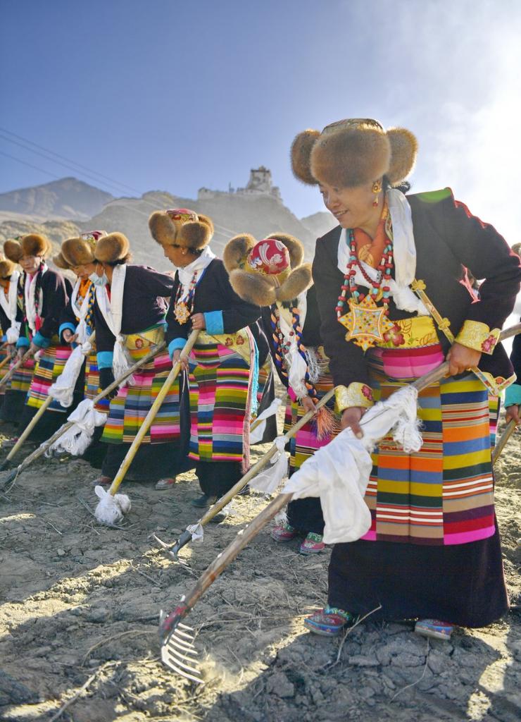 Villagers participate in a ceremony marking the start of spring farming in Changzhug Township of Shannan, southwest China's Tibet Autonomous Region, March 16, 2022. (Xinhua/Zhang Rufeng)