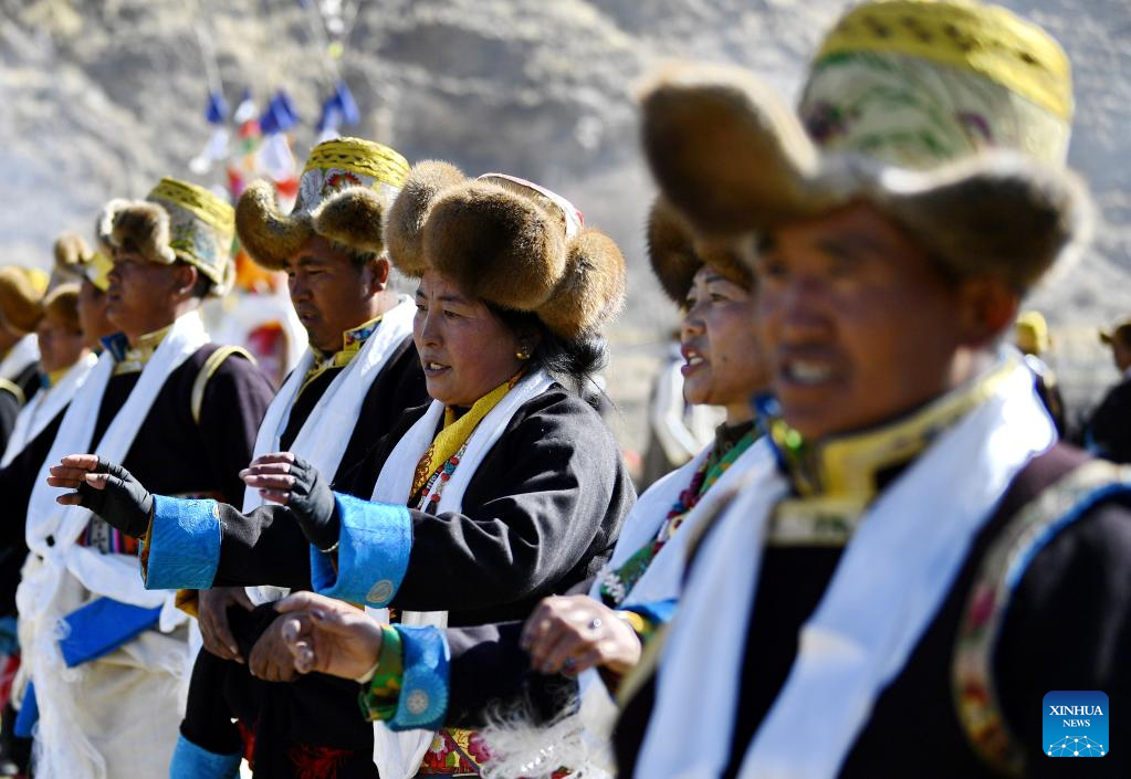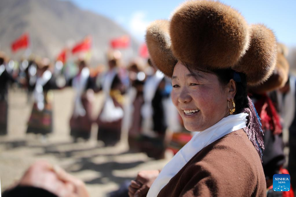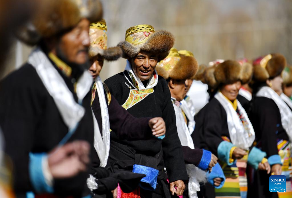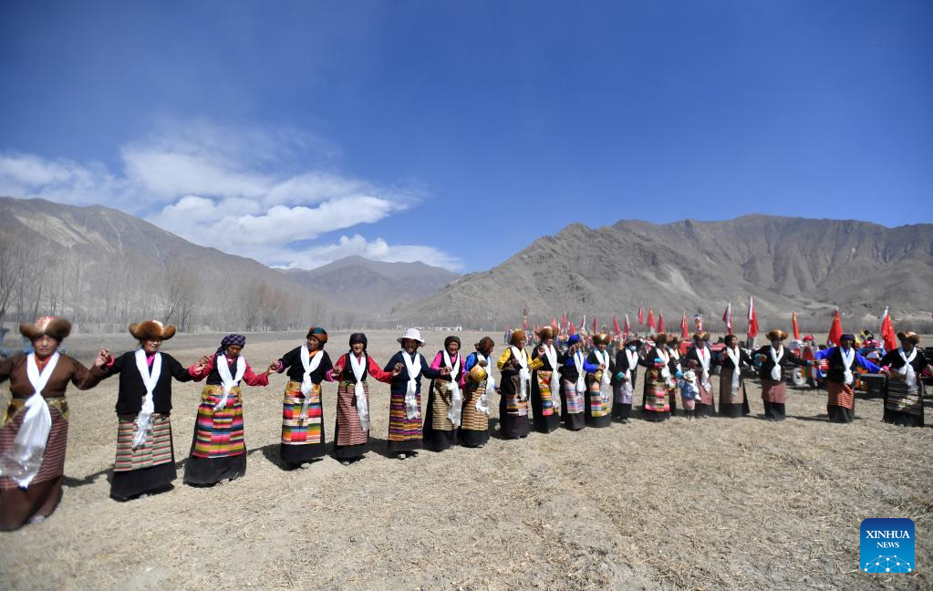 Villagers dance at a ceremony marking the start of spring farming in Carbanang Village, Quxu County of Lhasa, southwest China's Tibet Autonomous Region, March 16, 2022.