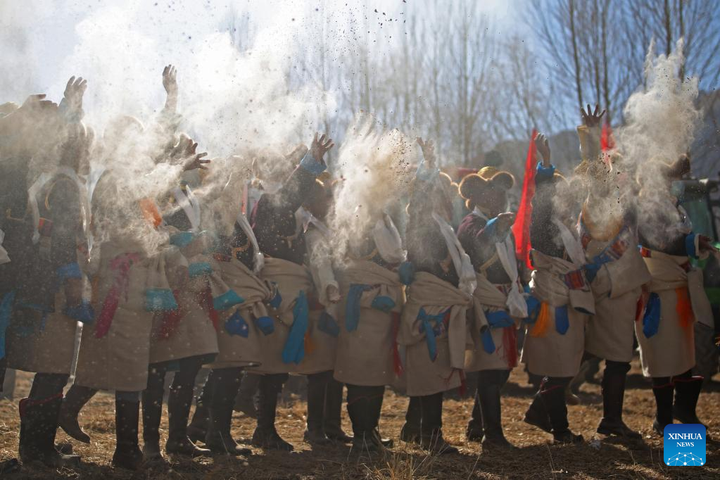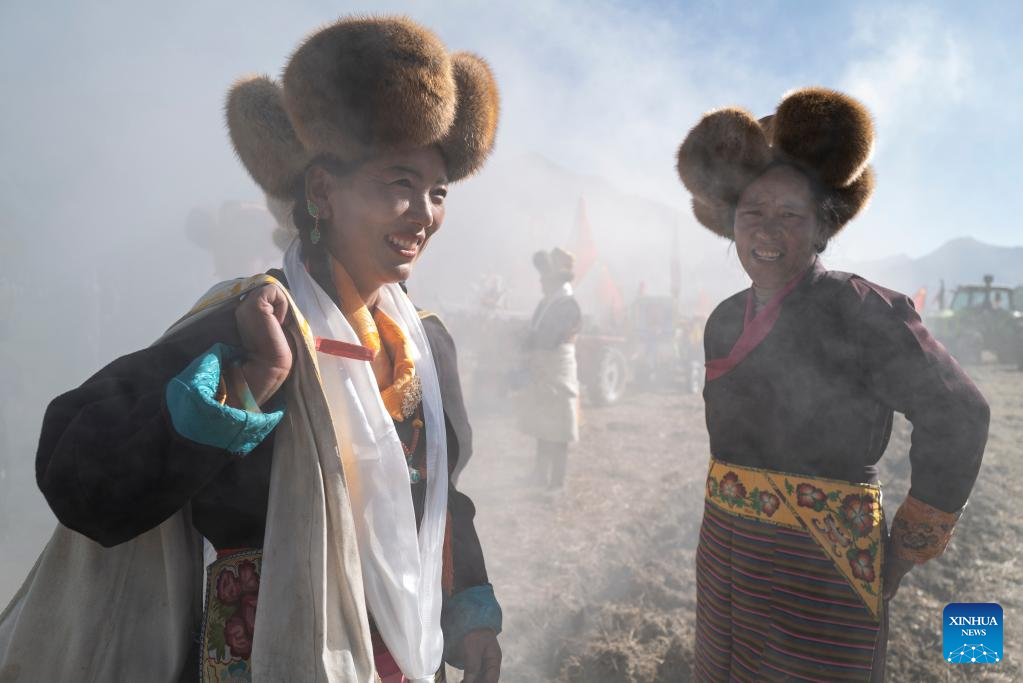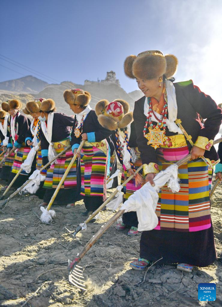 The annual spring farming ceremony was held in Tibet on Wednesday to pray for a bumper harvest of the year. (Xinhua/Chogo)