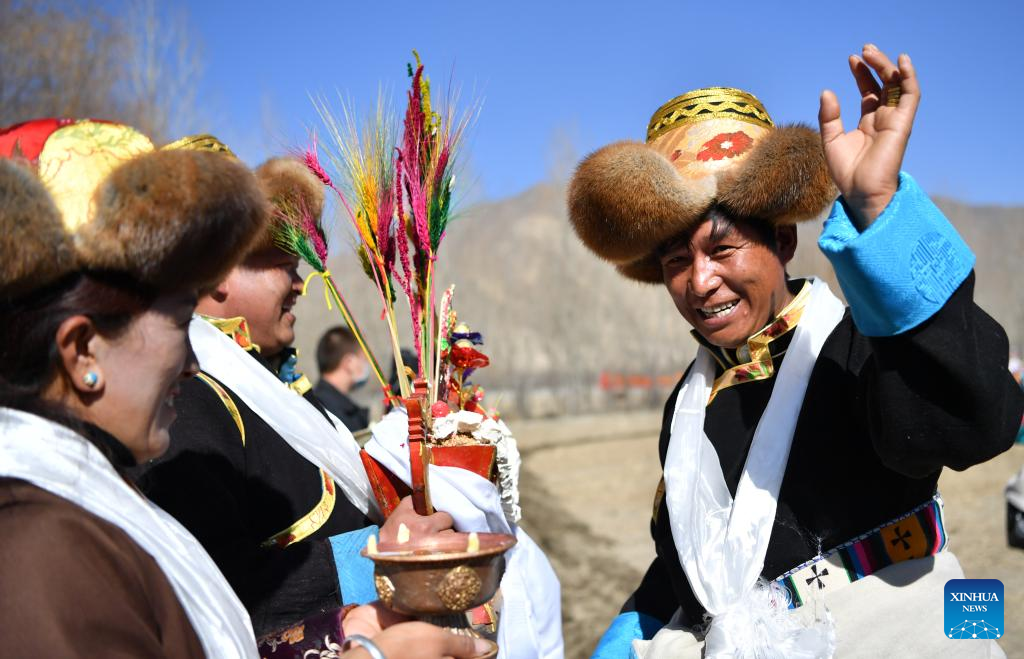 Villagers participate in a ceremony marking the start of spring farming in Carbanang Village, Quxu County of Lhasa, southwest China's Tibet Autonomous Region, March 16, 2022. The annual spring farming ceremony was held in Tibet on Wednesday to pray for a bumper harvest of the year. (Xinhua/Chogo)