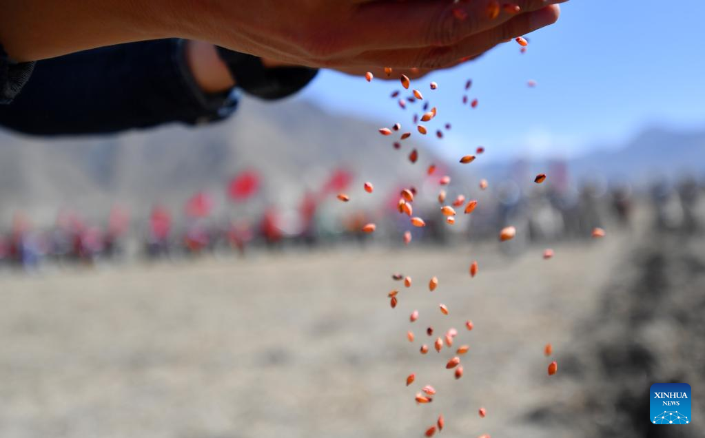 Seeds are sowed at a ceremony marking the start of spring farming in Carbanang Village, Quxu County of Lhasa, southwest China's Tibet Autonomous Region, March 16, 2022. The annual spring farming ceremony was held in Tibet on Wednesday to pray for a bumper harvest of the year. (Xinhua/Chogo)