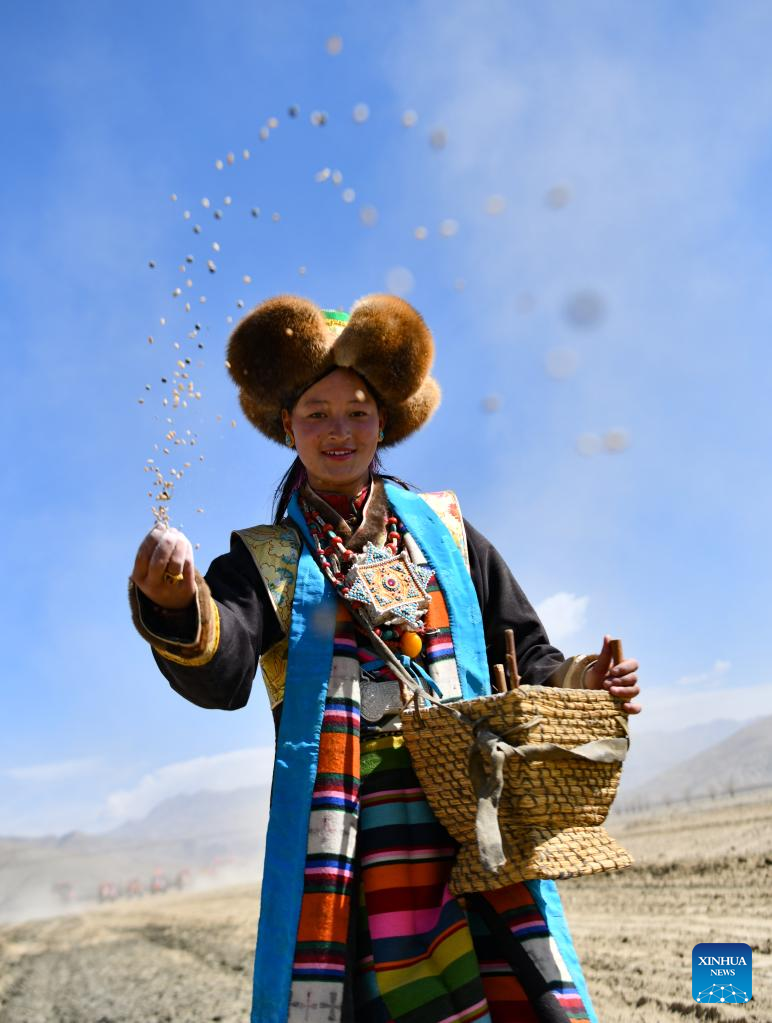 A villager sows seeds during a ceremony marking the start of spring farming in Gyangze County of Xigaze, southwest China's Tibet Autonomous Region, March 16, 2022. The annual spring farming ceremony was held in Tibet on Wednesday to pray for a bumper harvest of the year. (Xinhua/Jigme Dorje)