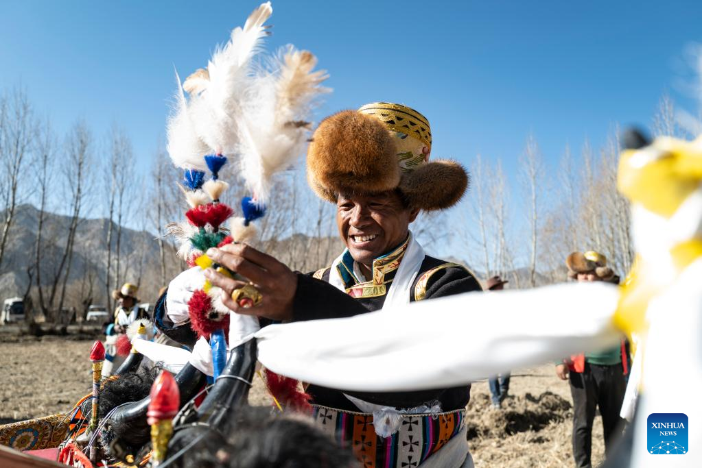 Villagers participate in a ceremony marking the start of spring farming in Carbanang Village, Quxu County of Lhasa, southwest China's Tibet Autonomous Region, March 16, 2022. The annual spring farming ceremony was held in Tibet on Wednesday to pray for a bumper harvest of the year. (Xinhua/Jiang Fan)