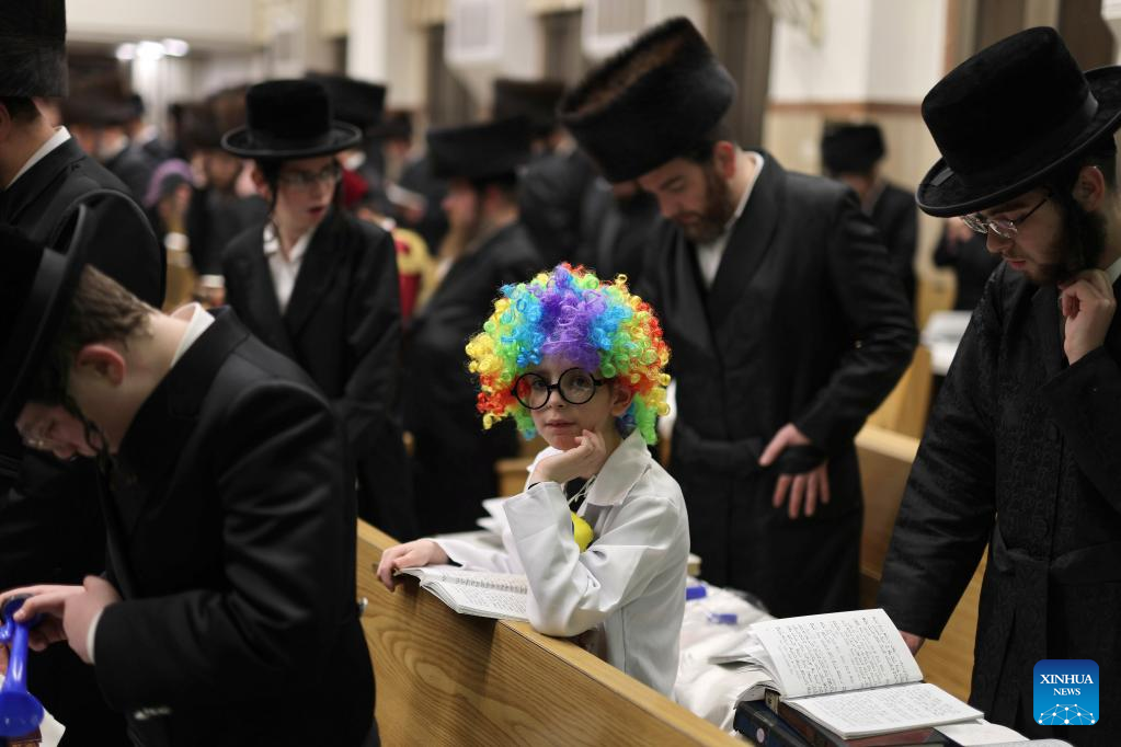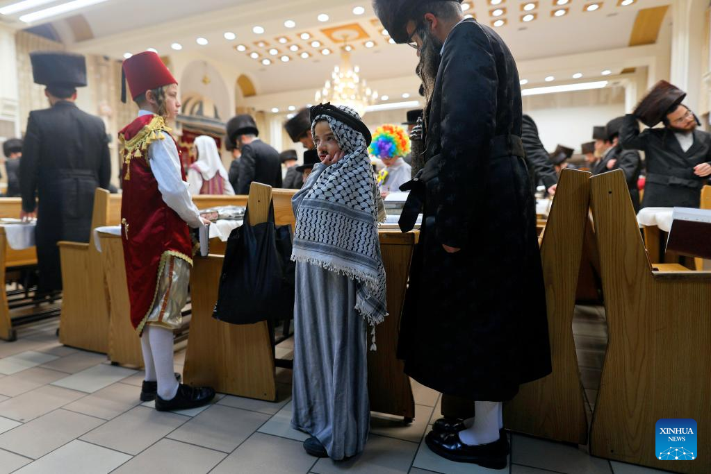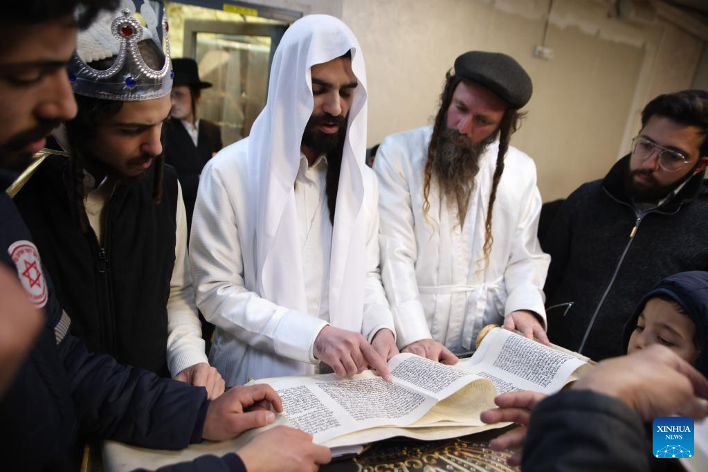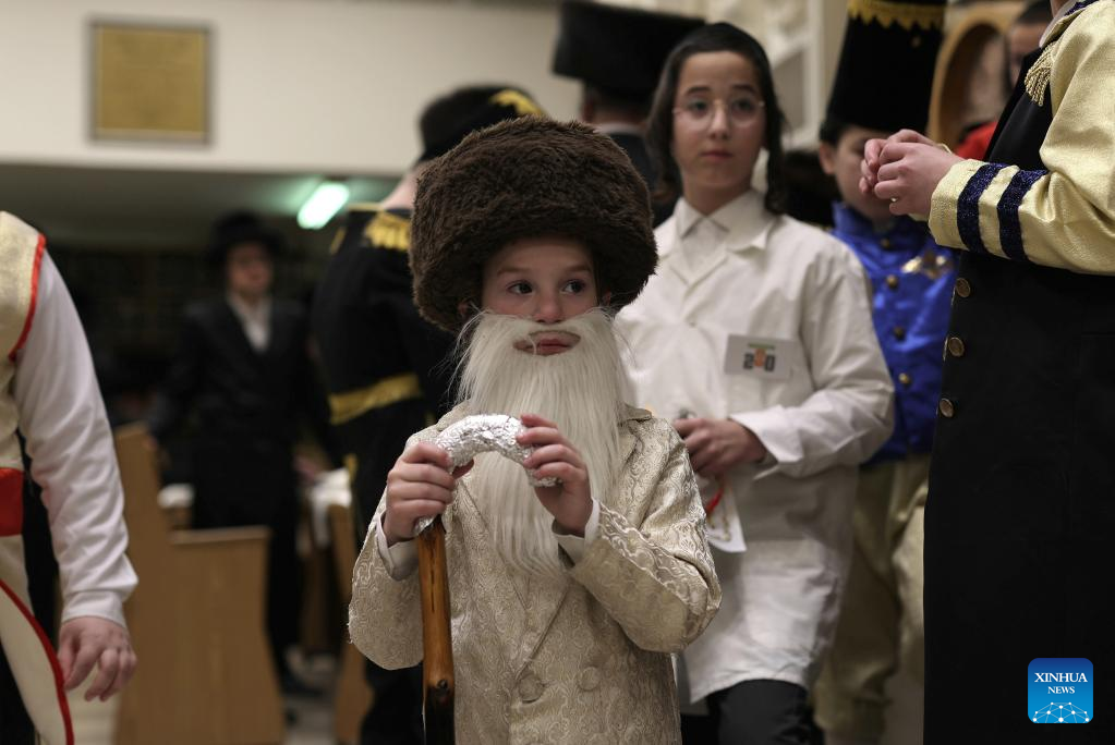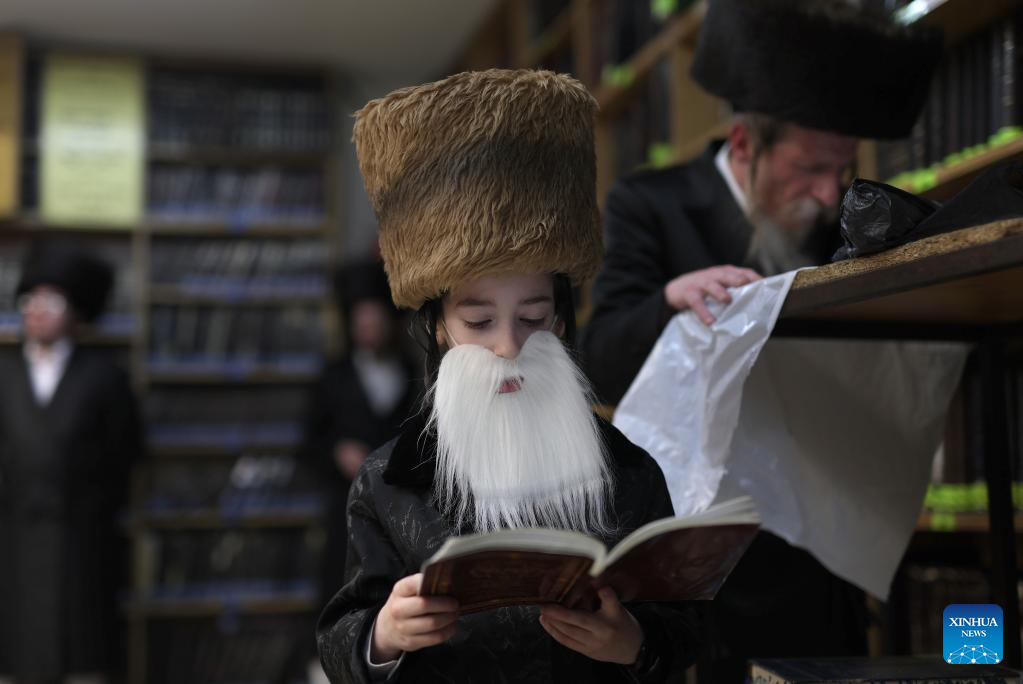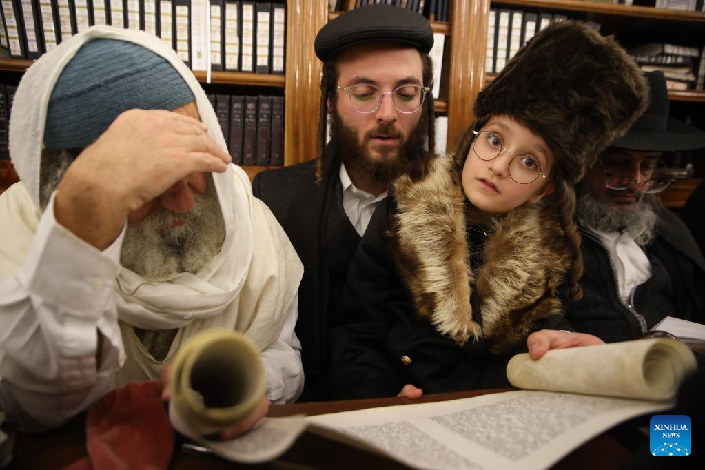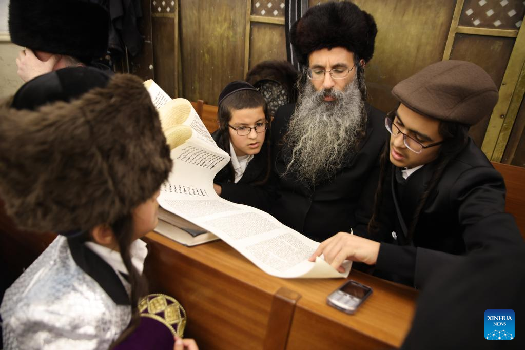Ultra-Orthodox Jews attend a reading of the Megillat Esther during the Jewish holiday of Purim at a synagogue in Ashdod, southern Israel, on March 16, 2022. Purim is a Jewish holiday that commemorates the deliverance of the Jewish people from Haman's plot during the reign of the ancient Persian Empire, according to the Biblical Book of Esther. (Ilan Assayag/JINI via Xinhua)