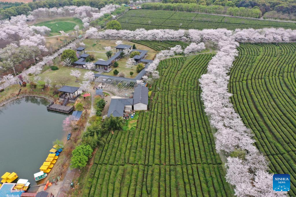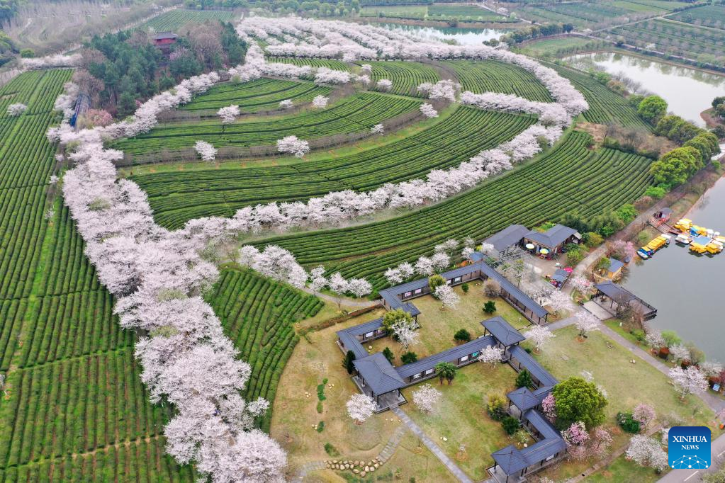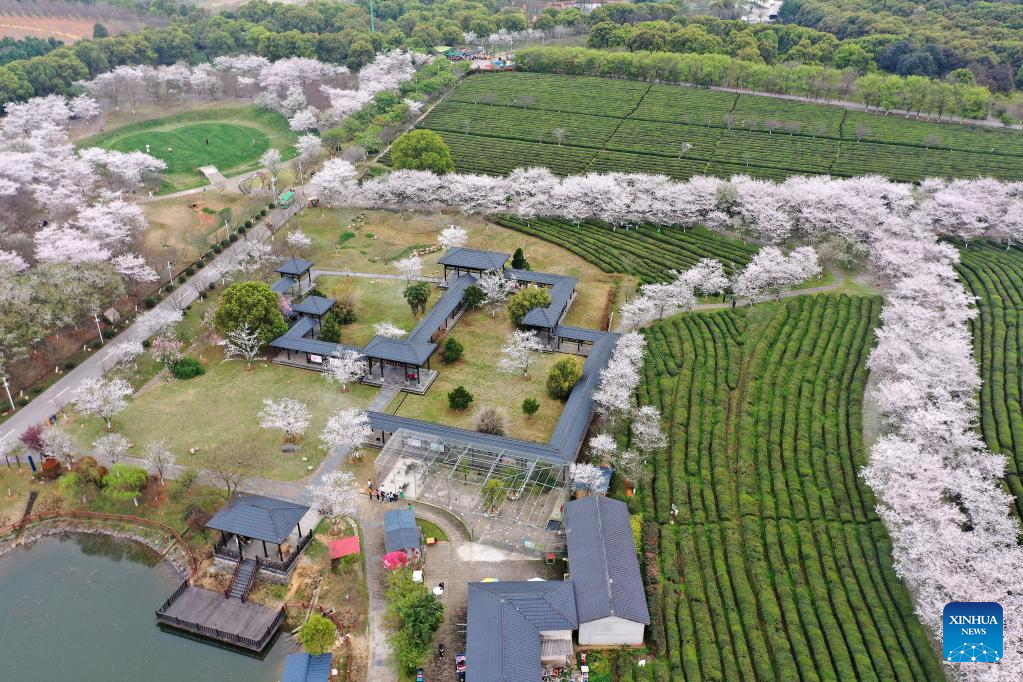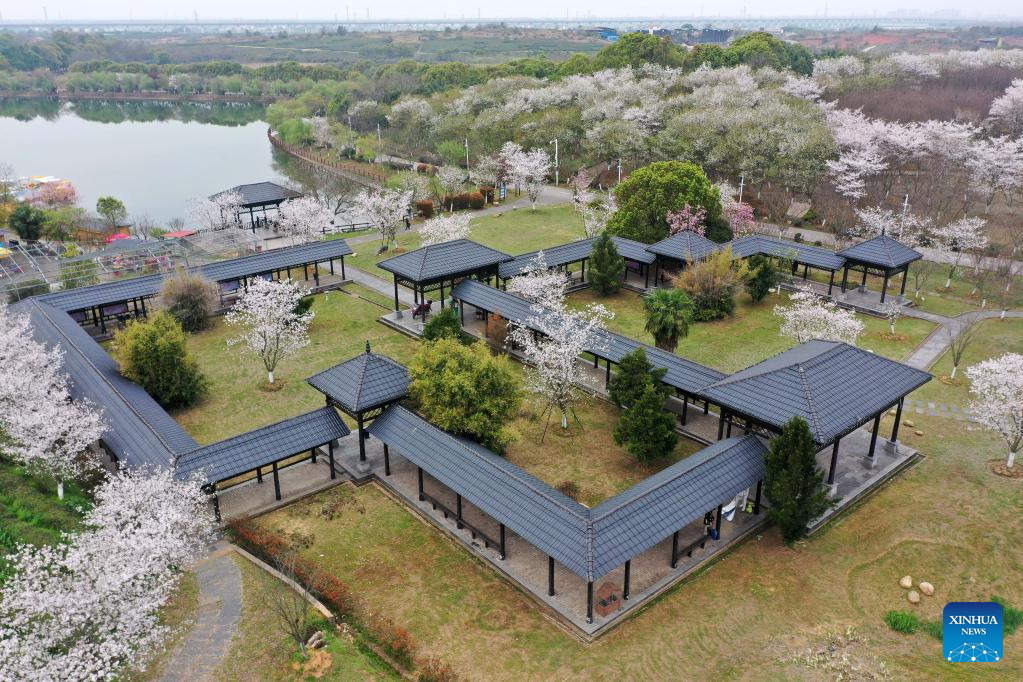 Aerial photo taken on March 16, 2022 shows blossoms at Fenghuanggou scenic area in Nanchang County of east China's Jiangxi Province. (Xinhua/Peng Zhaozhi)