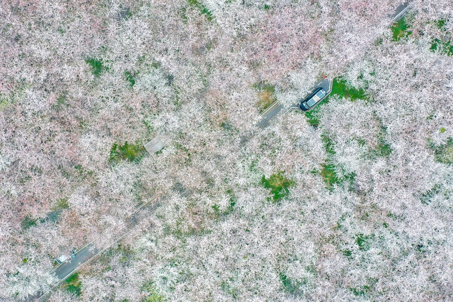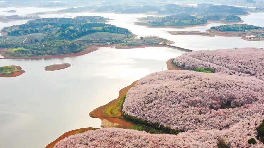 Aerial photo taken on March 17, 2022 shows blooming cherry blossoms at a cherry garden in Gui'an New Area of Guiyang, southwest China's Guizhou Province. (Xinhua/Ou Dongqu)