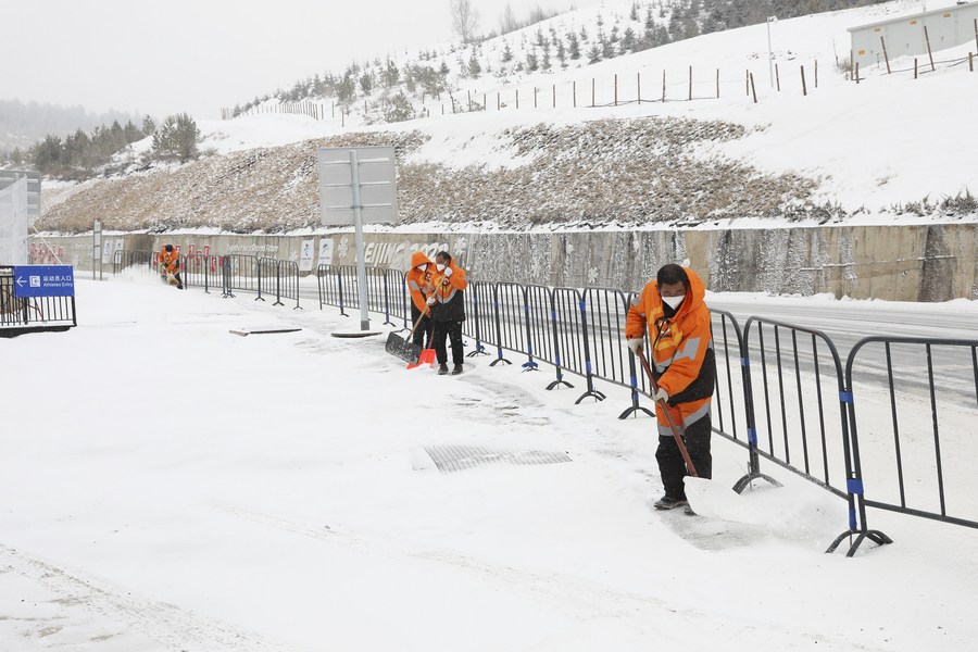 Staff members clean snow at Genting Snow Park in Zhangjiakou, north China's Hebei Province, March 17, 2022. (Photo by Wu Diansen/Xinhua)