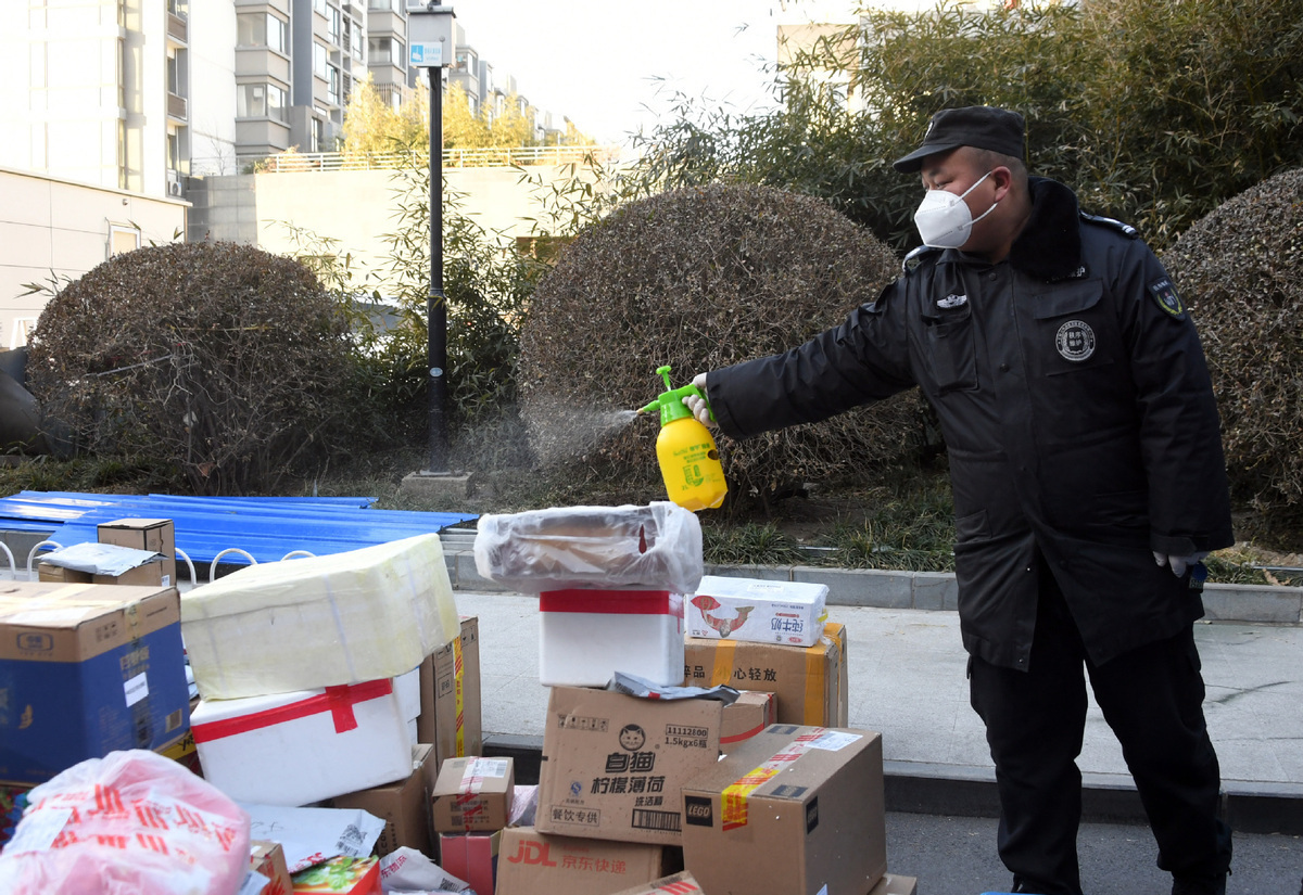 A house management staffer sprays disinfectants onto delivery packages at a community which has been sealed off after an Omicron case was detected in Beijing's Haidian District on Jan 16, 2022. [Photo/Xinhua]