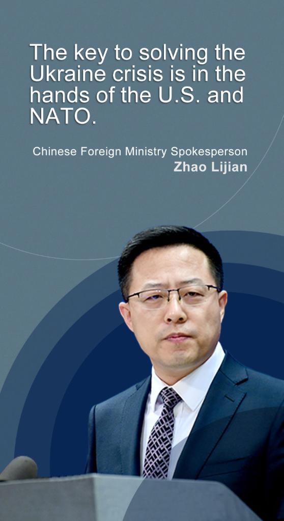 The U.S. government's decision on NATO's eastward expansion is directly linked to the current crisis in Ukraine, Zhao said, adding that the key to resolving the Ukraine crisis lies in the hands of the United States and NATO, and China hopes that the United States can truly stand on the side of peace and justice with most developing countries in the world to ease the situation in Ukraine.