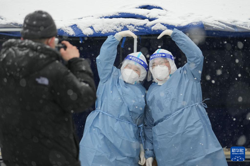 Medical workers pose for a photo during their break at a COVID-19 testing site in Beijing, capital of China, March 18, 2022. (Xinhua/Ju Huanzong)