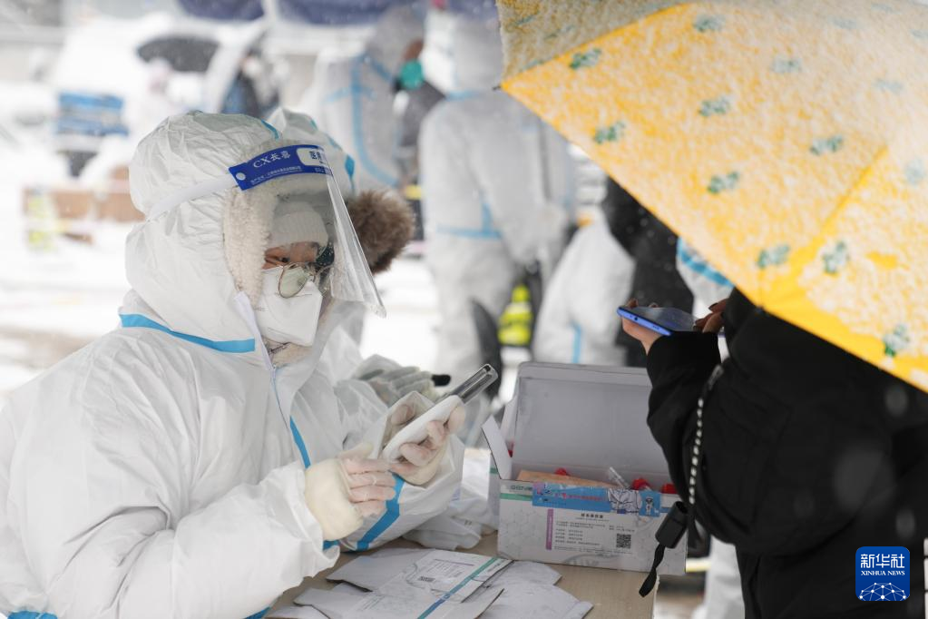 A staff member guides residents in snow at a COVID-19 testing site in Beijing, capital of China, March 18, 2022. (Xinhua/Ju Huanzong)