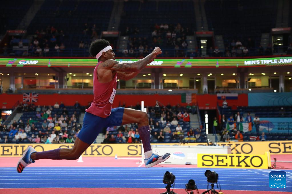 Donald Scott of the United States competes during the men's triple jump final at the World Athletics Indoor Championships Belgrade 2022 in Stark Arena, Belgrade, Serbia, March 18, 2022. (Xinhua/Shi Zhongyu)
