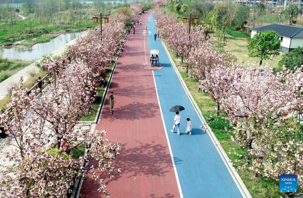 Aerial photo taken on March 19, 2022 shows people enjoying spring scenery in Peng'an County of Nanchong City, southwest China's Sichuan Province. (Photo by Liu Yonghong/Xinhua)