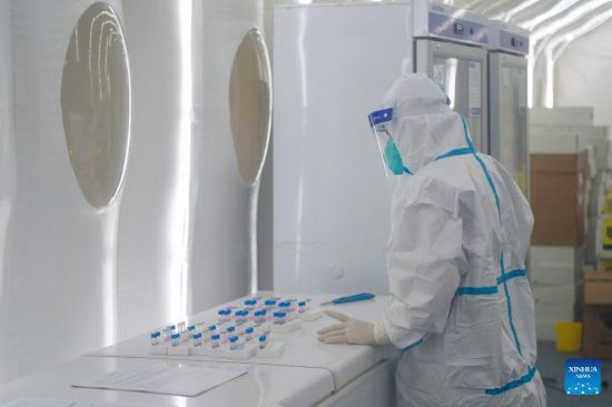 A medical worker is seen at a mobile laboratory for nucleic acid test in Harbin, northeast China's Heilongjiang Province, March 18, 2022.