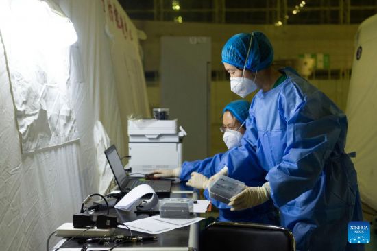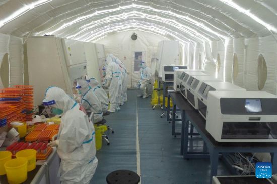 Medical workers are seen at a mobile laboratory for nucleic acid test in Harbin, northeast China's Heilongjiang Province, March 18, 2022.