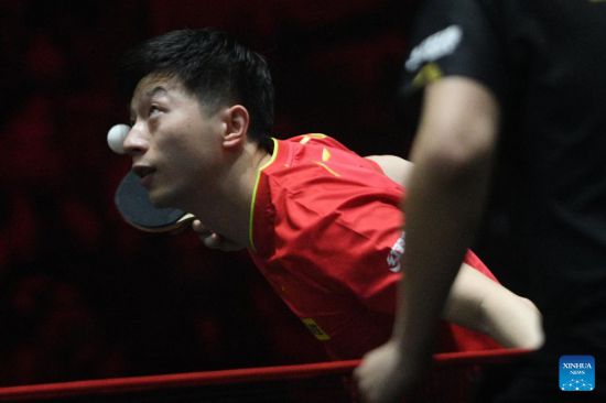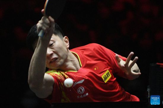 Ma Long of China hits a return during the men's singles semifinal against Liang Jingkun of China at the World Table Tennis (WTT) Singapore Smash 2022 in Singapore, March 19, 2022. (Photo by Then Chih Wey/Xinhua)