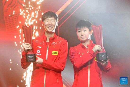 Wang Manyu (L)/Sun Yingsha of China lift the trophies after winning the women's doubles final match between Wang Manyu/Sun Yingsha of China and Hayata Hina/Ito Mima of Japan at the World Table Tennis (WTT) Singapore Smash 2022 in Singapore, March 19, 2022. (Photo by Then Chih Wey/Xinhua)